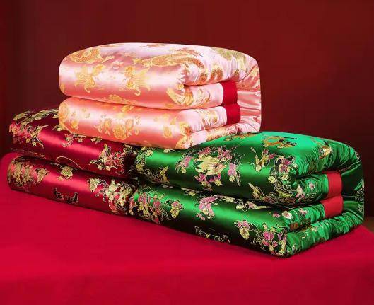 夹里上覆棉花胎再覆被面,由此组合的缝制过程,上海人叫“定被头”。被面在外看得见,面料比里面的夹里好。结婚被子的被面均绸缎,不管陪嫁有N条被,总要有几条织锦缎。当年,“百花锦”“金凤凰”都是上海被面名牌。