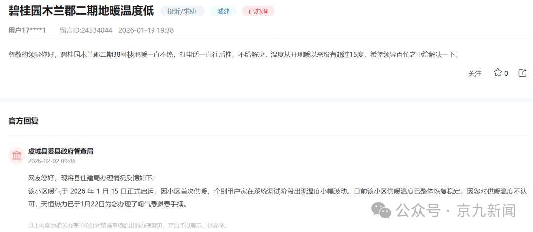 该小区暖气于2026年1月15日正式启运,因小区首次供暖,个别用户家在系统调试阶段出现温度小幅波动。目前该小区供暖温度已整体恢复稳定。因您对供暖温度不认可,天恒热力已于1月22日为您办理了暖气费退费手续。