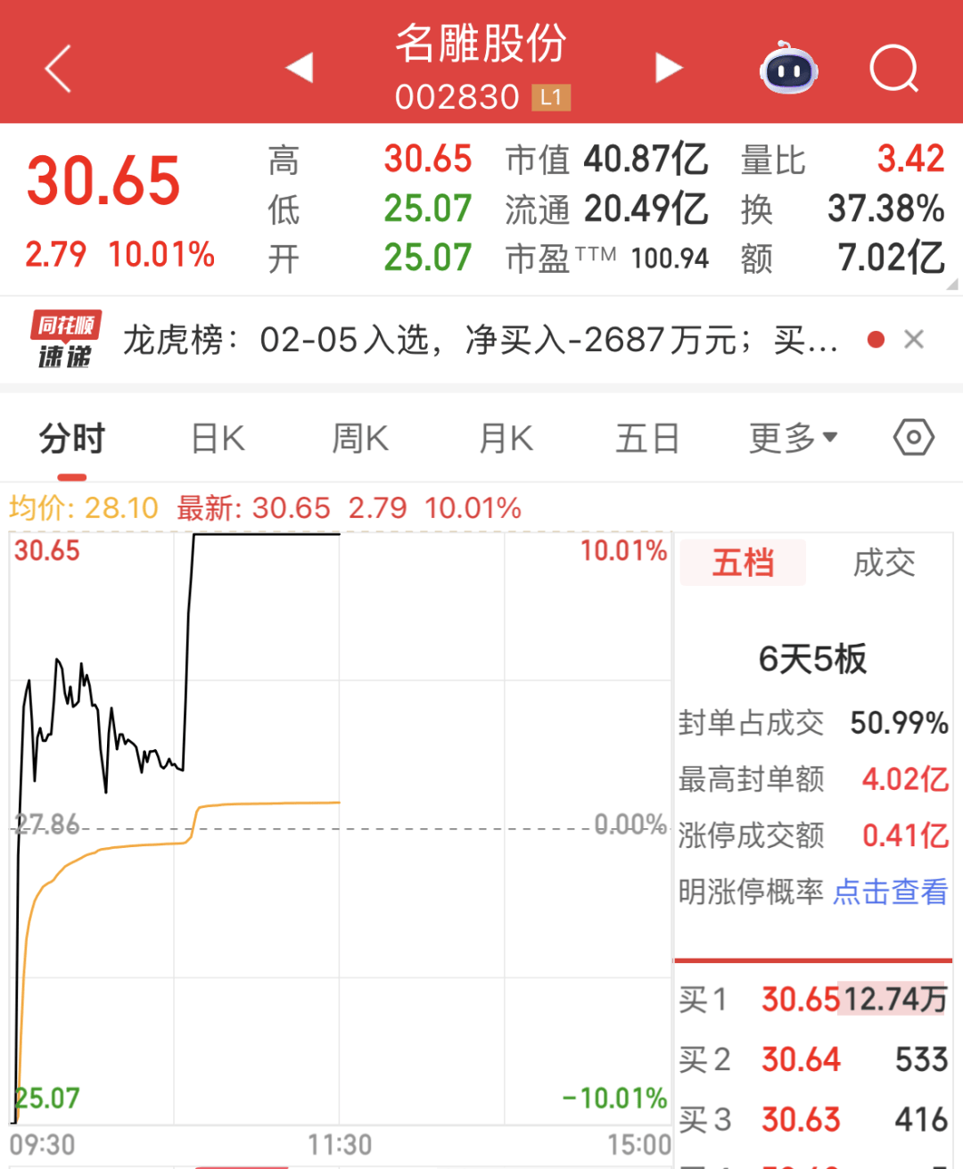 2月6日早盘,名雕股份(002830)以跌停价开盘,开盘两分钟内即打开跌停板,随后快速翻红,10时30分后拉升至涨停;截至午间休市,仍有12.74万手买单封板,封单资金达到3.91亿元。