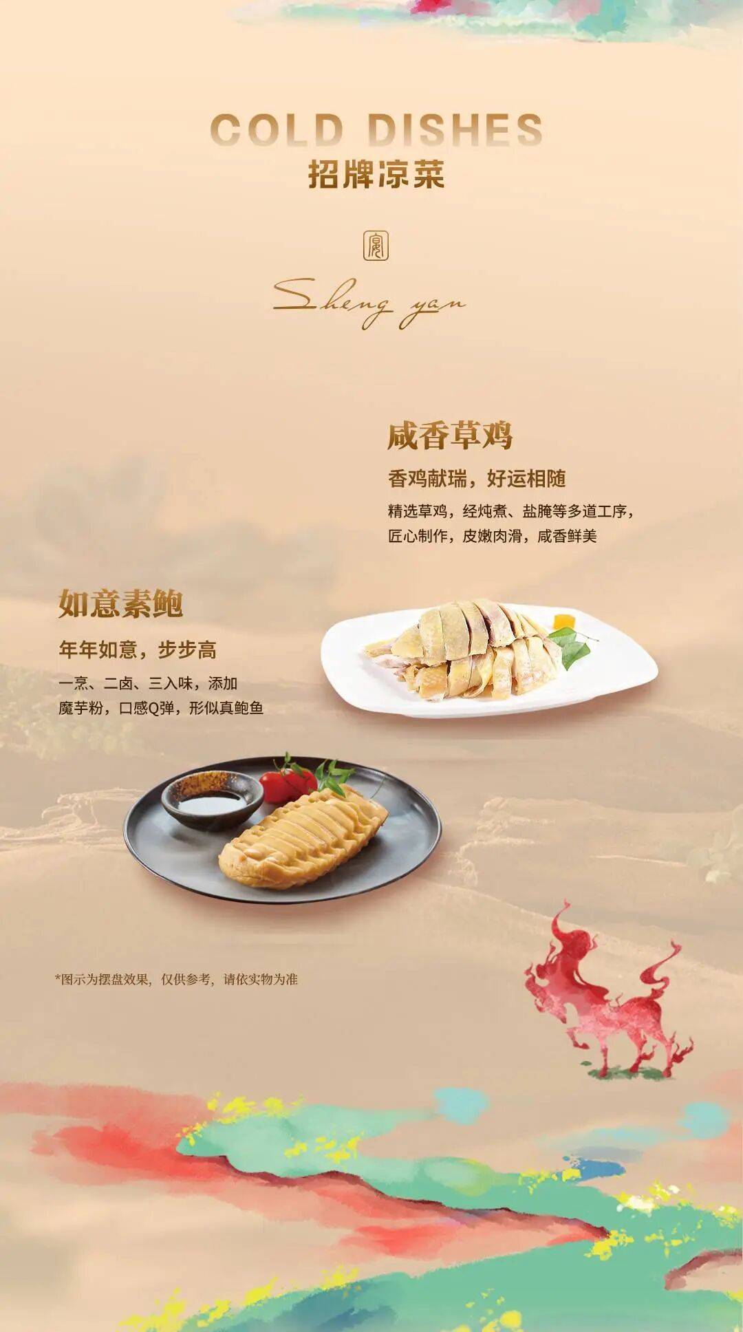 冷菜( 2道):咸香草鸡、如意素鲍