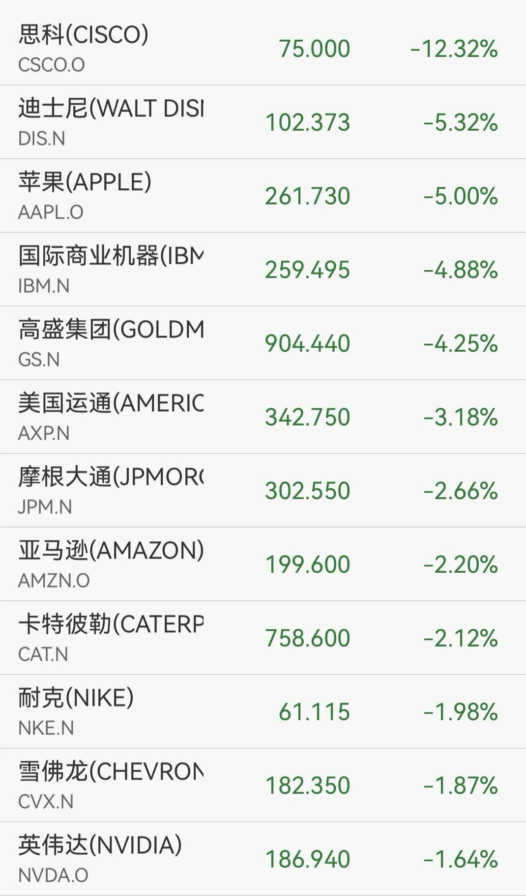 思科跌超12%,迪士尼跌逾5%,领跌道指。大型科技股集体走低,苹果重挫5%,创2025年4月以来最大日跌幅;脸书跌近3%,英伟达跌超1%。