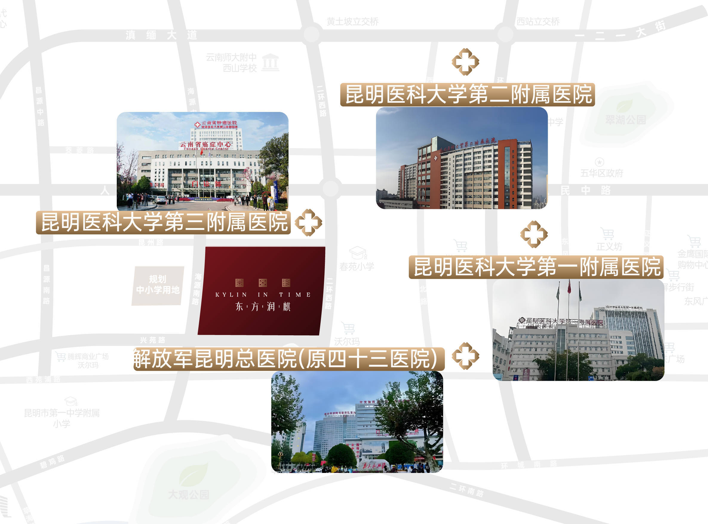 昆明医科大学第三附属医院肿瘤医院、昆明医科大学第一附属医院(云大医院)、昆明医科大学第二附属医院(工人医院)、四十三医院