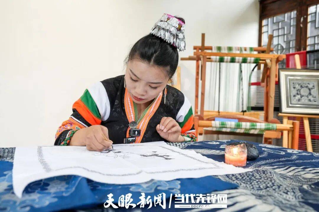 ▲织金县平远古镇的依文・中国手工坊数字化产业基地内,绣娘王秋雨正向在场游客展示如何在素布上勾勒出飞鸟纹样。