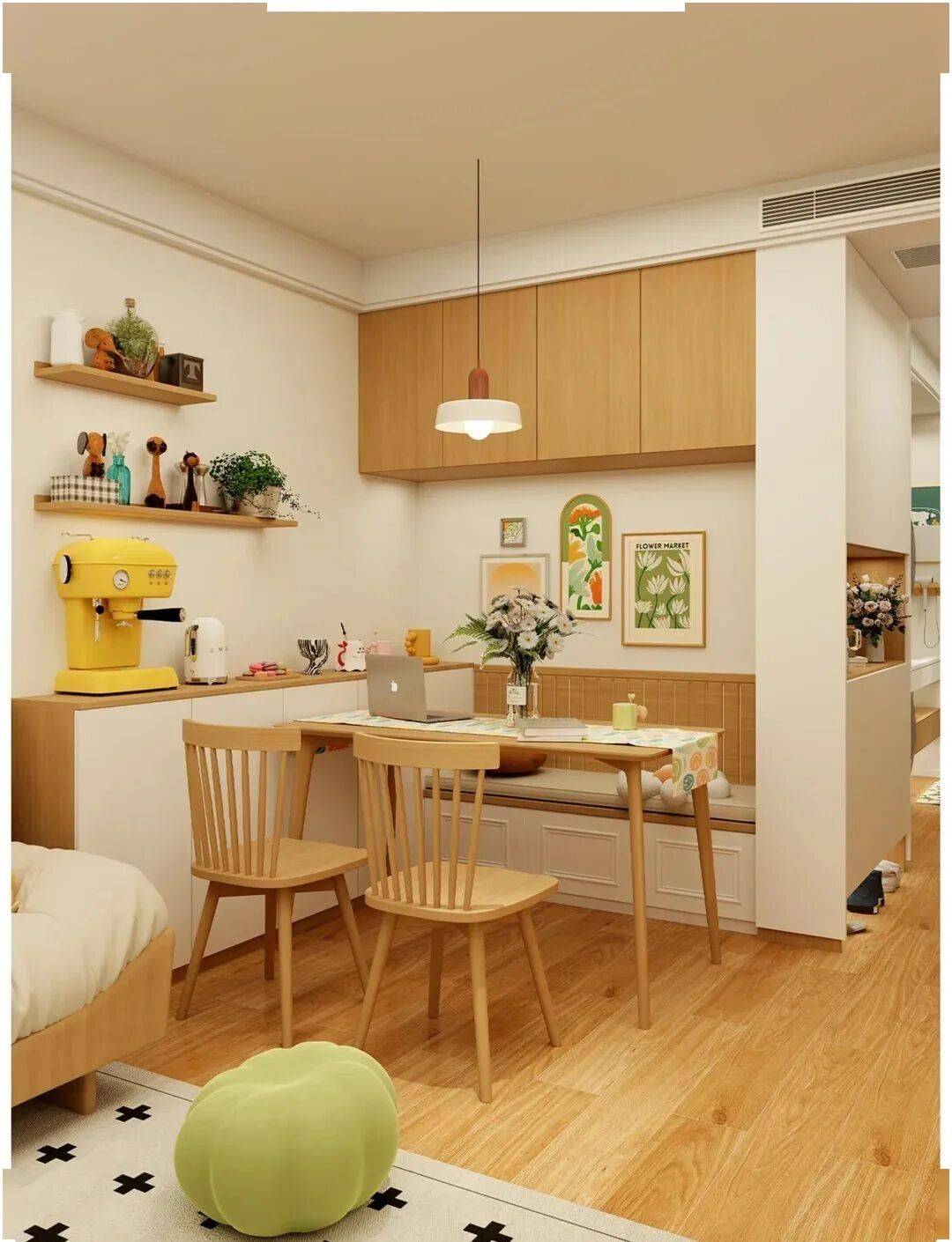 沿着窗户或者墙壁来进行固定卡座的打造,并且搭配上一张尺寸可以灵活变动的餐桌,如此便会立刻营造出好像咖啡馆一样的温馨氛围。