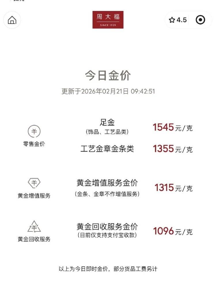 国内黄金饰品价格对比显示,多家黄金珠宝品牌当日公布的境内足金首饰价格涨回至1500元上方。其中,周大福报价1545元/克,较前一日每克上涨46元;周六福报价1540元/克,较上一日每克上涨46元;周生生报价1550元/克,较上一日每克上涨48元。