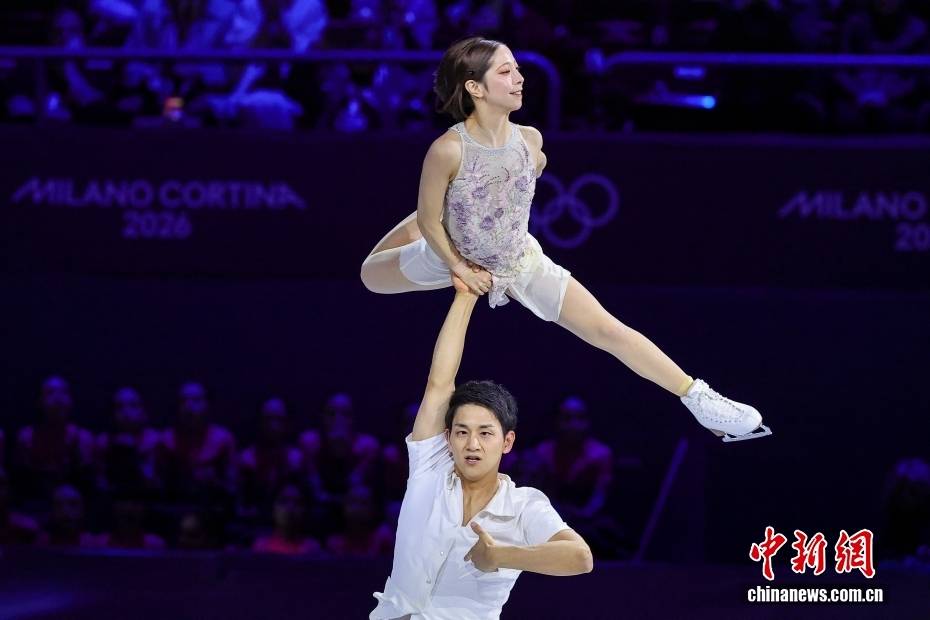 当地时间2月21日晚,2026年米兰-科尔蒂纳冬奥会花样滑冰表演滑在意大利米兰举行。图为日本双人滑组合三浦璃来(上)/木原龙一亮相。中新社记者 骆云飞 摄