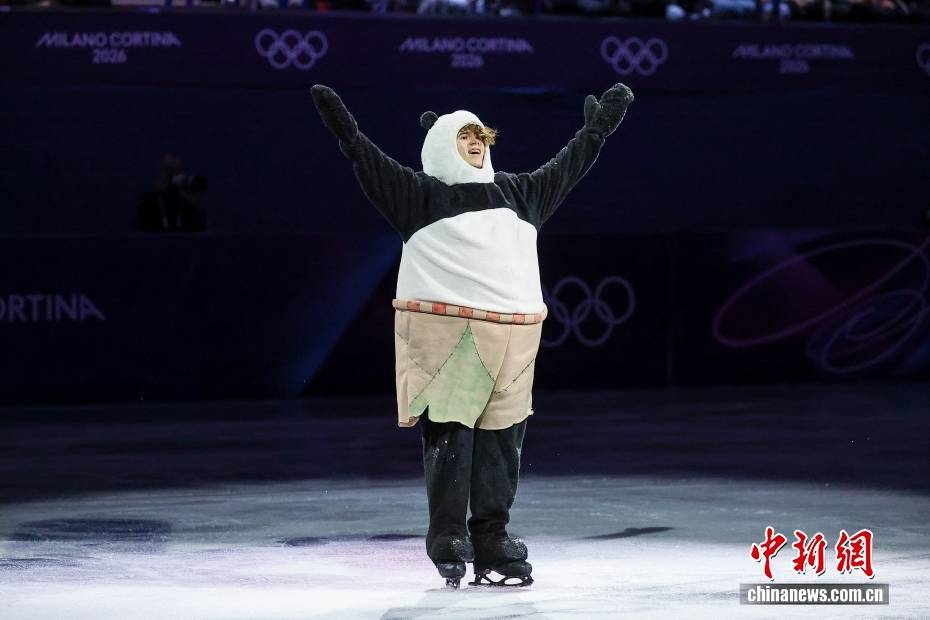 当地时间2月21日晚,2026年米兰-科尔蒂纳冬奥会花样滑冰表演滑在意大利米兰举行。本届冬奥会花样滑冰男子单人滑冠军、哈萨克斯坦选手萨多洛夫扮成大熊猫亮相。中新社记者 蒋启明 摄