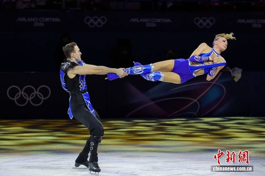 当地时间2月21日晚,2026年米兰-科尔蒂纳冬奥会花样滑冰表演滑在意大利米兰举行。图为德国双人滑组合哈泽(上)/沃洛丁亮相。中新社记者 骆云飞 摄