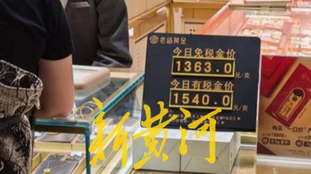 如果说服装区是热闹,那黄金饰品区则更为火爆。老庙黄金门口醒目的价格牌上显示:今日免税金价1363元/克,有税金价1540元/克,算下来每克价差高达177元。