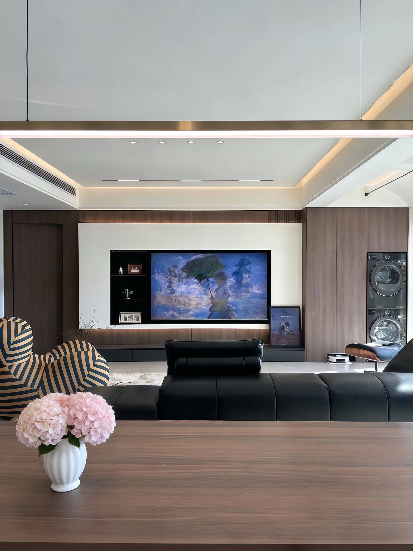 年前刚交付的这套案子,让我印象特别深。业主是个艺术收藏家,偏爱沉稳的木质感。我用深木饰面打底,搭配白色电视墙,把他的藏品藏进开放格;黑色皮质沙发和条纹单人椅一摆,整个客厅既有气场又不压抑,顶部的线性灯,是他点名要的“氛围感神器”。