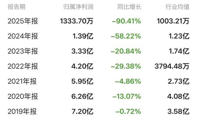 读创财经发现,大亚圣象的净利润已连降7年。2019年至2025年,公司归母净利润分别下滑0.72%、13.07%、4.86%、29.38%、20.84%、58.22%、90.41%。