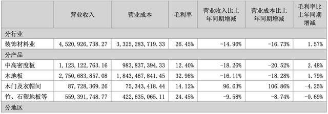 分行业看,报告期内,装饰材料业营业收入4,520,926,738.27元,较上年同比减少14.96%。分产品看,中高密度板营业收入1,123,122,763.16元,较上年同比减少18.26%;木地板营业收入2,750,683,857.08元,较上年同比减少16.11%;木门及衣帽间营业收入较上年同比增加96.63%。
