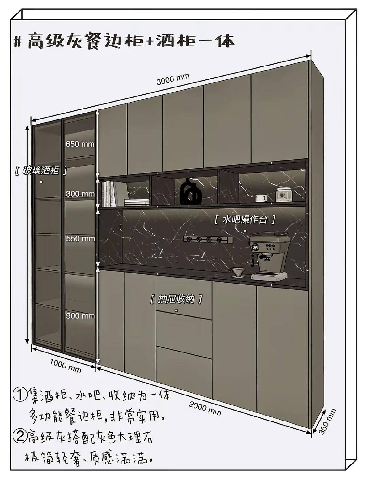 极简轻奢风格,功能齐全。左侧玻璃酒柜分层合理(650mm/300mm/550mm/900mm),中间水吧台操作便捷,右侧抽屉收纳杂物。