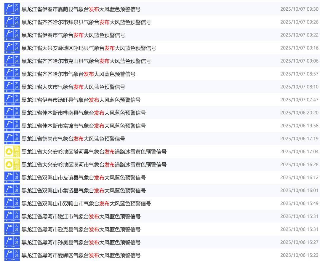 黑龙江多地发布大风预警 ,截至小编发稿,共有22个大风预警生效中……