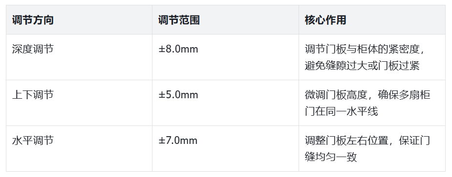这种大范围的调节能力,让安装不再“差之毫厘,谬以千里”,即使存在微小误差,也能通过调节实现柜门横平竖直、缝隙均匀的完美效果。