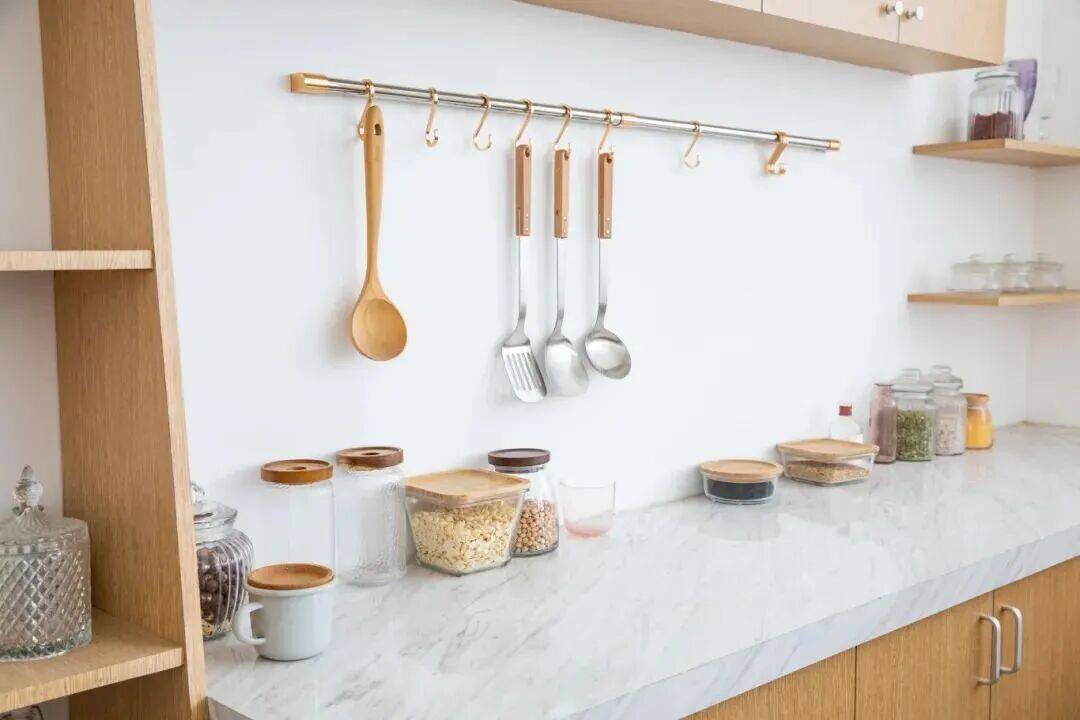 垂直空间利用:在橱柜侧板加装 “挂杆+挂钩”,挂勺子、铲子、厨房剪刀,节省台面和抽屉空间;层板间加装 “可伸缩分层架”,碗碟、盘子竖直摆放,还能避免磕碰。