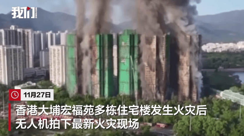 11月27日,香港大埔宏福苑多栋住宅楼发生火灾后,无人机拍下最新火灾现场。大厦内仍冒烟现火光,外墙被烧黑。大量脚手架因被烧毁从高空坠落,现场还不断传出爆炸声响。