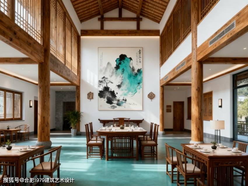 内部空间功能分区清晰合理,涵盖12间主题客房、公共茶室、庭院景观区、自助厨房、休闲书吧及亲子互动区。设计亮点突出在地文化表达:客房融入安庆黄梅戏纹样、桐城派书法元素,以原木、竹编为主要材质,搭配素雅软装,营造静谧旅居氛围;公共茶室采用挑高设计,搭配徽派花窗与青砖地面,成为体验皖式茶文化的核心场景。