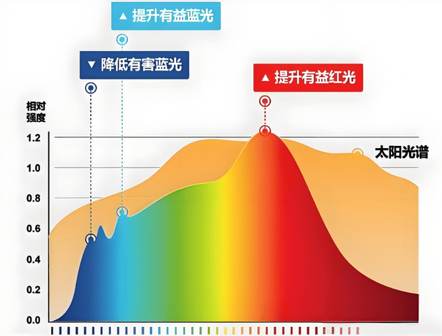真正的护眼光源要尽可能模拟太阳光的自然光谱——蓝光峰值低、有益红光占比高、光谱连续无断层。
