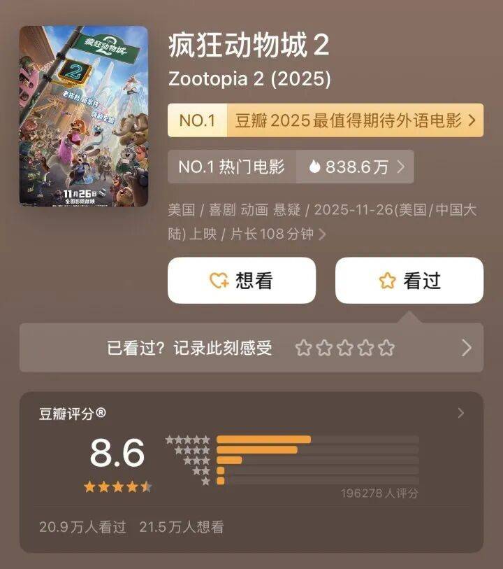 目前,《疯狂动物城2》在豆瓣上的评分虽不及前作的9.3分,但也达到了8.6分,观众如此评论道,“第一部堪称跳出迪士尼动画固有框架的革命之作,第二部很难复刻初见时在设定和隐喻层面带来的惊艳感,诚然新意欠奉,但降低预期后仍不失为一款综合素质优秀的常规商业续集”“虽然没做到超越首集,但做到了持平首集,首集的主题是打破刻板印象,续集便是在扩充世界观中,打破孤立在外的爬虫类的刻板印象,同时也在阴谋论中追本溯源,介绍动物城真正的起源”……