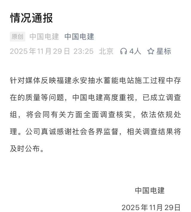 针对媒体反映福建永安抽水蓄能电站施工过程中存在的质量等问题,中国电建高度重视,已成立调查组,将会同有关方面全面调查核实,依法依规处理。公司真诚感谢社会各界监督,相关调查结果将及时公布。