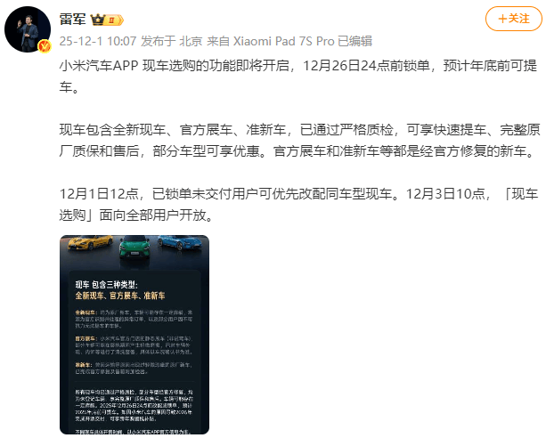 12月1日12点,已锁单未交付用户可优先改配同车型现车。12月3日10点,“现车选购”面向全部用户开放。小米汽车表示,所有现车都已通过严格质检,部分车型经官方修复,都是没有登记过的车辆。购买现车,可享快速提车、完整原厂质保和售后,部分车型可享优惠。2025年12月26日24点前锁单,预计2025年底前可提车。如因小米汽车的原因导致2026年完成开票交付,可享跨年购置税补贴。