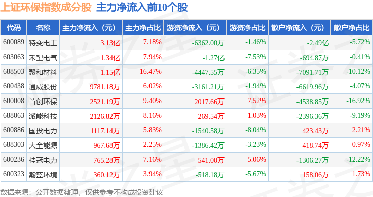 资金流向方面,上证环保(000158)指数成份股当日主力资金净流出合计2.83亿元,游资资金净流出合计1266.97万元,散户资金净流入合计2.96亿元。成份股资金流向详情见下表:
