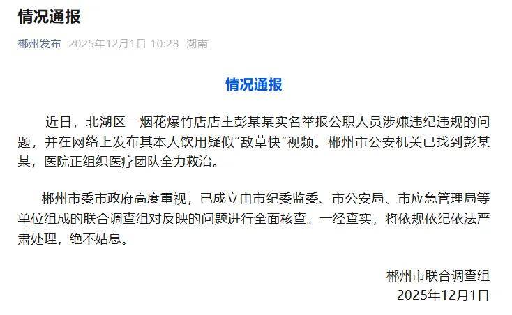 ▶烟花爆竹店店主举报公职人员并疑似饮用“敌草快”,官方通报: