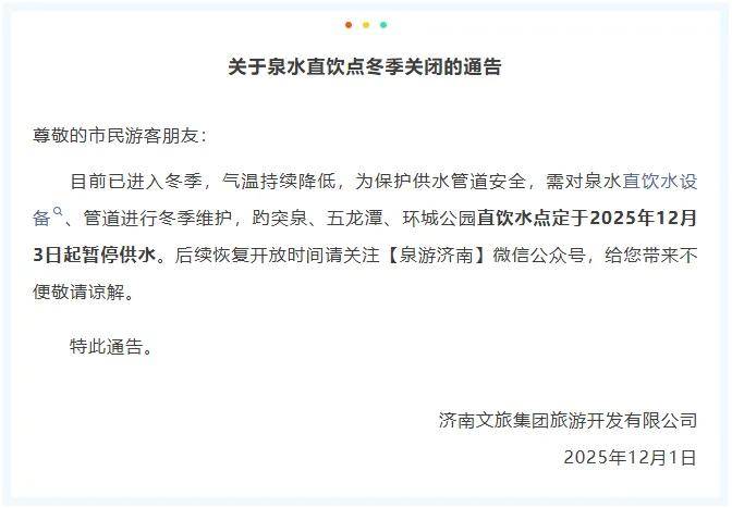 ▶为保护供水管道安全,需对泉水直饮水设备、管道进行冬季维护,趵突泉、五龙潭、环城公园直饮水点定于2025年12月3日起暂停供水。