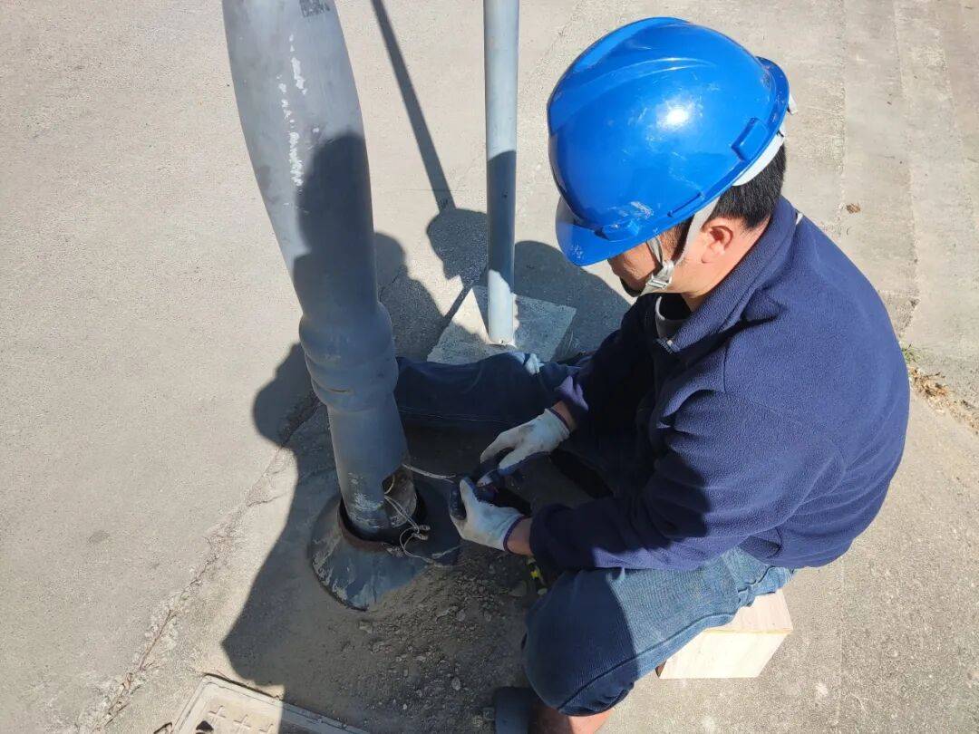 11月27日,路灯维修人员在对河西河堤庭院灯进行检修