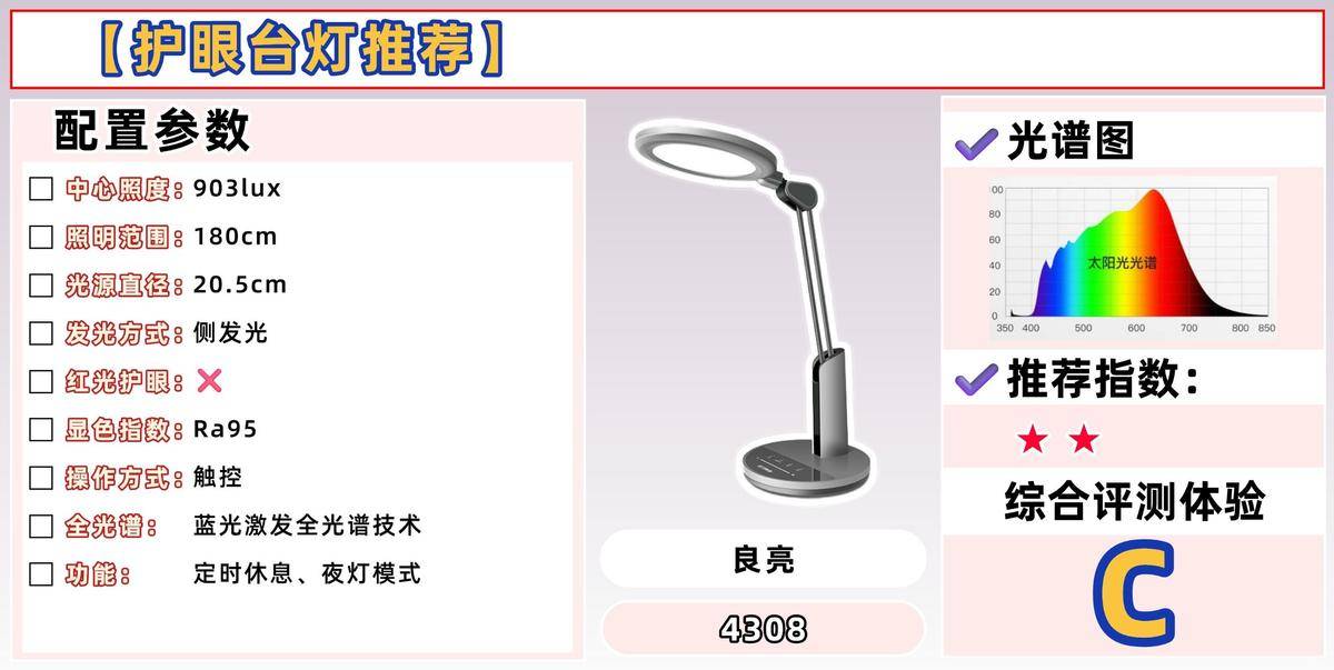 护眼灯最好的牌子有哪些?良亮4308护眼台灯的光线经过漫射过滤处理,照出来柔和又均匀,照明覆盖范围达到国AA级标准,日常看书、写作业是够用的。功能上比较贴合基础需求,色温在3000K-5000K之间,搭配滑动调光设计,切换冷暖光、调明暗都很方便。显色指数能到Ra95,看东西颜色还原得比较真实,不会失真。还配备了45分钟休息提醒,能帮着避免用眼过度,附带的小夜灯功能,晚上起夜或轻度补光也能用。不过它没什么进阶功能,整体配置比较基础,而且滑动调光的手感一般,调节时不够顺滑。