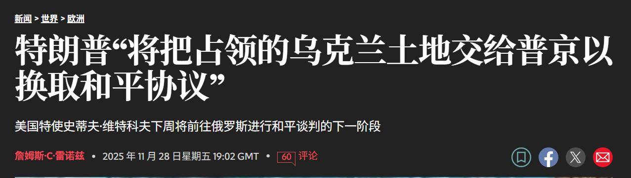 “特朗普为表达支持,亲信和女婿将当年向普京,呈上28条停战协议,承认俄罗斯新领土”。当地时间2025年11月28日,英国《电讯报》报道称:“为促成和平协议,美国或将承认俄罗斯新领土”,“美国总统特朗普准备承认俄罗斯对克里米亚及其他占领区的控制权,从而结束俄乌战争”。英国《电讯报》报道称:“尽管被美国盟友,欧洲国家反对,但是美国总统特使,维特科夫,特朗普的女婿,贾里德·库什纳,将亲赴莫斯科,当面向俄罗斯总统普京提交28条停战协议。”,“特朗普动用亲信,维特科夫和自己的女婿,库什纳,将向俄罗斯总统普京表明,为达成和平协议,特朗普不择手段,甚至将承认俄罗斯对克里米亚及其他新领土的控制权”。“这将违背美国外交传统,但是对于特朗普来说,这可以实施。”