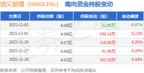 证券之星消息,12月2日南向资金减持32.9万股信义玻璃(00868.HK)。近5个交易日中,获南向资金增持的有4天,累计净增持485.5万股。近20个交易日中,获南向资金增持的有17天,累计净增持1919.47万股。截至目前,南向资金持有信义玻璃(00868.HK)4.68亿股,占公司已发行普通股的10.56%。