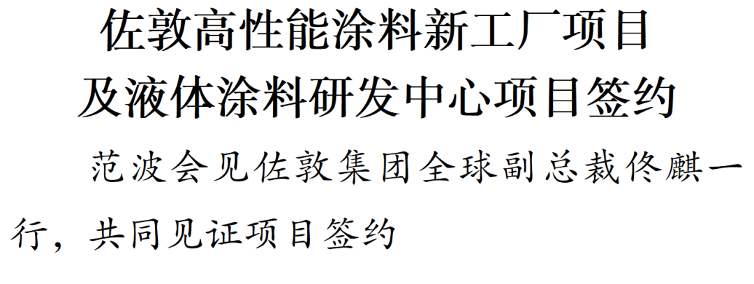 12月2日,总投资3. 3亿美元的佐敦高性能涂料新工厂项目及液体涂料研发中心项目签约落地苏州张家港。苏州市委书记范波会见了佐敦集团全球副总裁佟麒·卡赞奇奥卢一行,共同见证项目签约。