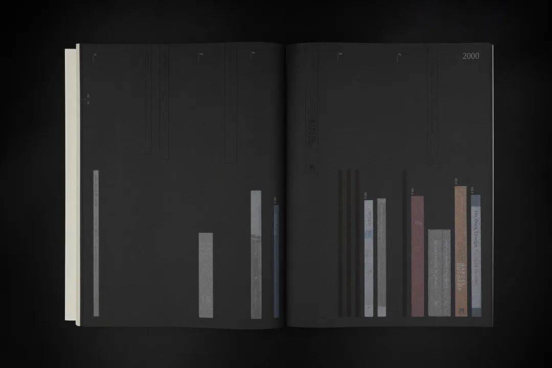 正如博物馆依靠展品的分类进行陈列,选集亦是如此。在这本选集中,书籍按照一定的类型如:年份、评审、国家或奖项来划分。这样的逻辑看似清晰——但它难以让人信服。将1993年一栏精心排布的衬线体文字与一张2020年充满张力的无衬线跨页文字进行比较,就如同试图比较两夜相隔数十年的梦——终究徒劳。我们总以为自己看见了某种趋势倾向:某个时代偏好分栏排版,另一个时代热衷于非对称构图;某一个年代在网格中寻求设计的安全感,另一个十年偏爱黑色墨水满版印刷的页面。但这些感知并无根据。所谓的“趋势”在仔细推敲之下便会消失得无影无踪。它们只是幻象,是观者为了从杂乱中寻找秩序而生出的海市蜃楼。