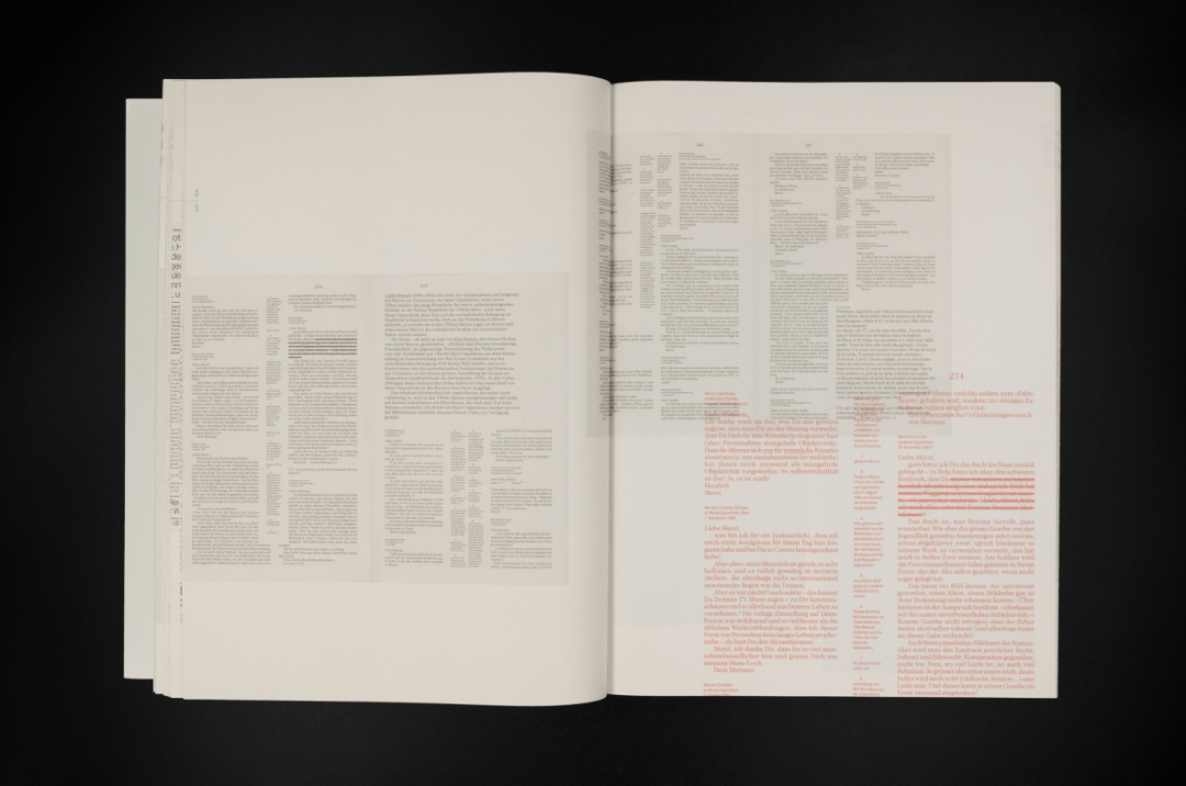 然而,当我们翻阅书页时,所感受到的远不只是这些幻象。这本选集所呈现出来的并非一段线性的历史,而是一幅实验性的地图——获奖书籍的思维架构在这里被翻译为页边距、网格、转行与字形。每一本获奖图书,都像是一座微缩的城市:其中包含着字体所形成高低起伏的地形,墨与纸之间光影的舞步。当它们被缩减至原书的1/4大小时,这些城市便呈现出全新的面貌:街道被压缩,形态被提炼,结构如从高空俯瞰的遗迹般一览无余。这些因复制而产生的距离,让我们得以从制高点观察这些微缩的“城市”。我们由此看见了原先不可见的事物:字母的间距、页边距的分量、网格的节奏。在这里,版式不仅是“被观察”的对象,它更像是“被倾听”的旋律。每一张跨页都成为停顿与强调的乐谱;每一次对齐,都是对“文字应如何栖居于空间”的小小辩证。1/4尺寸图像的排列遵循着一种安静的秩序——从大到小——仿佛尺度本身,便是将它们串联起来的隐藏线索。