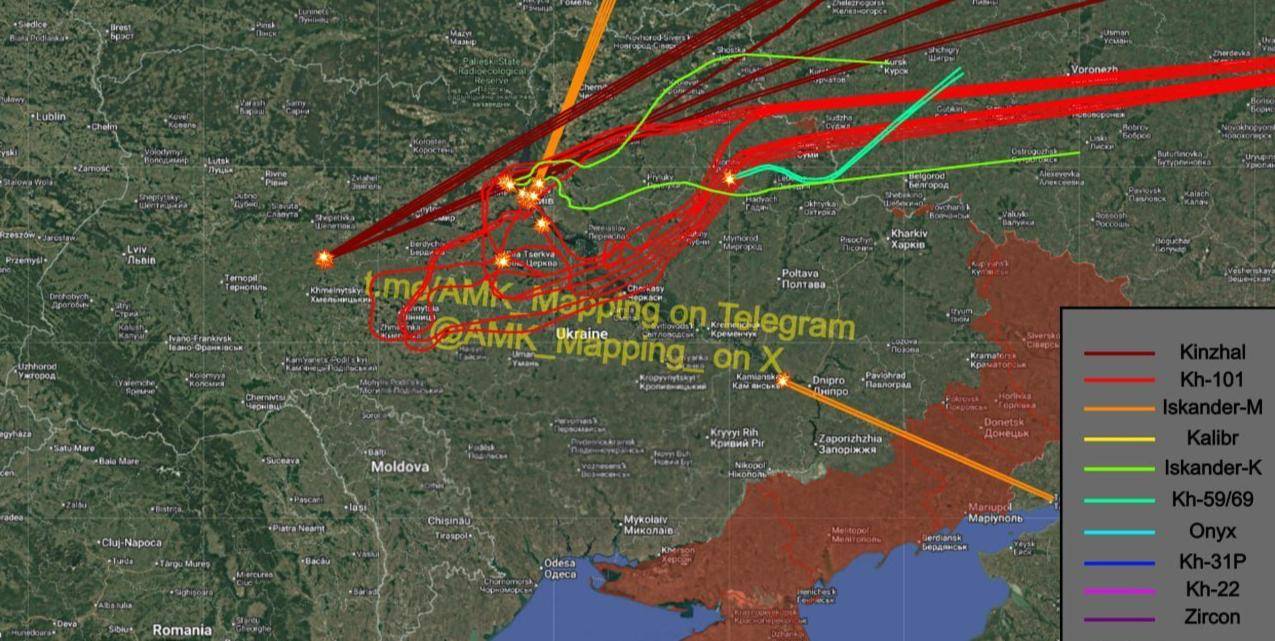 第聂伯罗彼得罗夫斯克州卡缅斯克水电站,俄军发射了2枚伊斯坎德尔-M战术弹道导弹轰炸,乌克兰苏梅州皮夫尼奇诺克拉伊斯卡750千伏变电站,俄罗斯空天军苏-57战斗机发射了2枚Kh-69隐身巡航导弹轰炸,基辅州CHP-6热电厂,被俄军米格-31K战斗机发射2枚匕首高超音速导弹袭击,基辅州白教堂热电厂,俄罗斯空天军图-95MS战略轰炸机发射了5枚Kh-101导弹实施大轰炸。