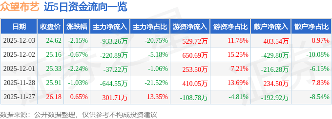 12月3日的资金流向数据方面,主力资金净流出933.26万元,占总成交额20.75%,游资资金净流入529.72万元,占总成交额11.78%,散户资金净流入403.54万元,占总成交额8.97%。
