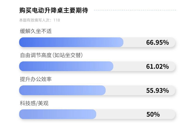 健康刚需化: 32%的受访者每日久坐时间超过9小时,使得针对久坐的健康管理成为迫切需求。高达67%的办公族期待通过电动升降桌缓解身体不适,61%的用户将桌子能否实现“高度自由调节”视为核心功能。