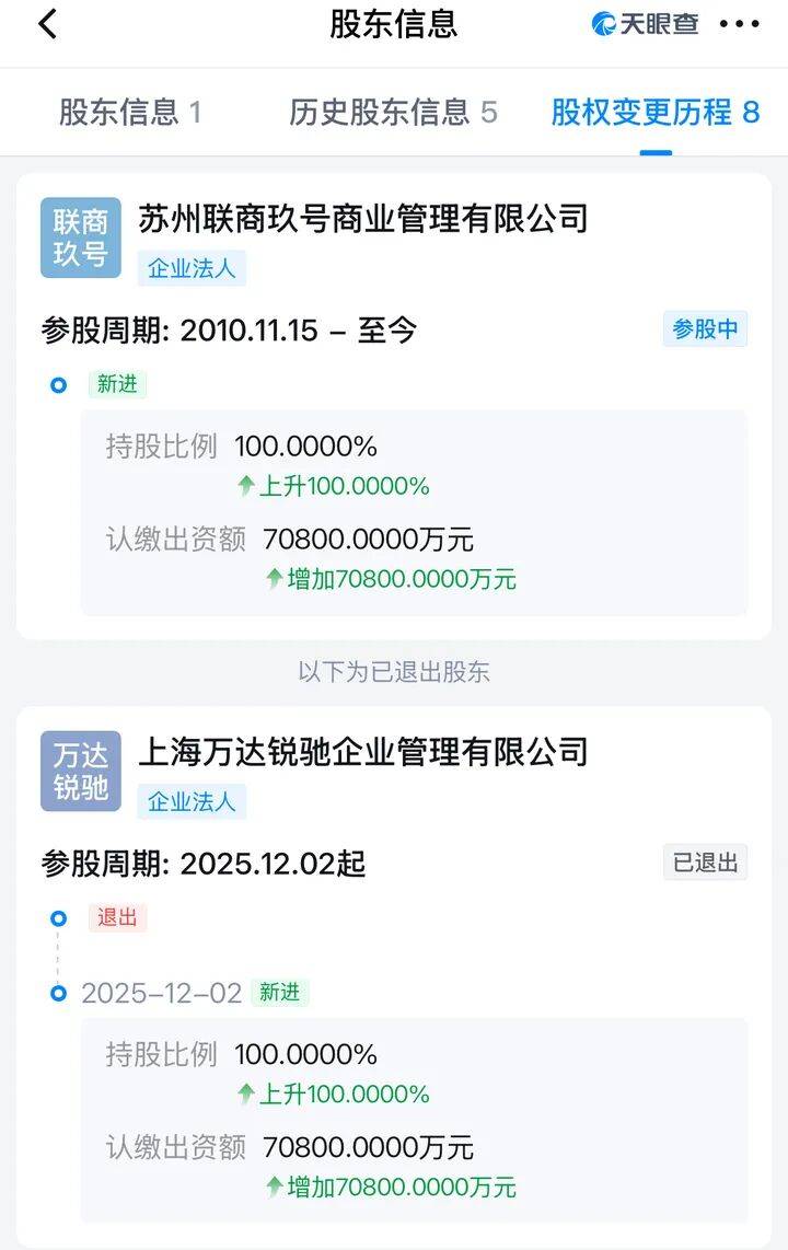 天眼查工商信息显示,12月3日,烟台芝罘万达广场有限公司再次发生工商变更,上海万达锐驰企业管理有限公司退出股东行列,新增苏州联商玖号商业管理有限公司全资持股,同时法定代表人、主要人员也发生变更。