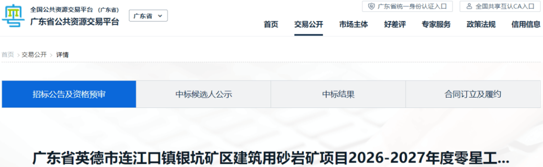 2025年12月3日,广东省公共资源交易平台发布英德市连江口镇银坑矿区建筑用砂岩矿项目2026-2027年度零星工程施工招标公告。