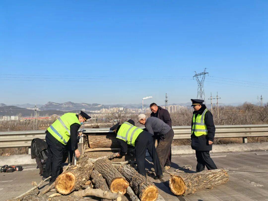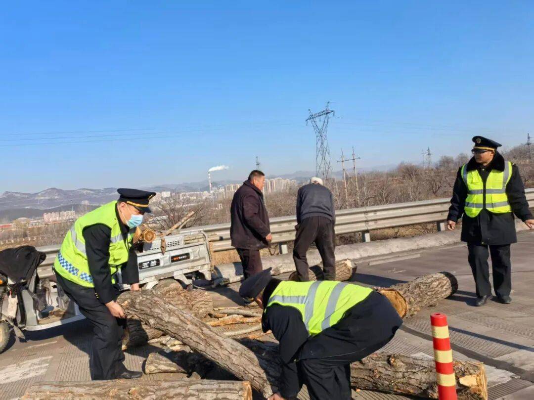 岗亭值守的四班收费人员见状,立即赶到现场。众人分工协作:几名队员合力扶正三轮车并检查制动、轮胎状况;其余人员弯腰伸手,徒手搬运、捡拾并规整捆扎木材。整个救援过程有条不紊,十余分钟便恢复车辆与货物正常状态。