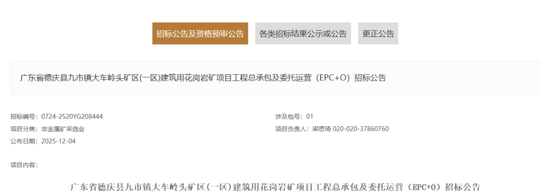 近日,广东省德庆县九市镇大车岭头矿区(一区)建筑用花岗岩矿项目工程总承包及委托运营(EPC+O)招标,标人为广东诚安润建新材料科技有限公司。该项目开采储量建筑用花岗岩16582.68万立方米,砂质高岭土254.81万立方米(折合368.72万吨)。