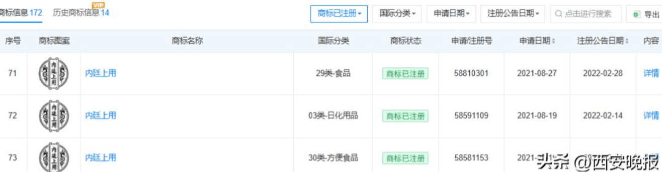 红星资本局在天眼查看到,北京同仁堂兴安保健、北京同仁堂(四川)药业此前在食品、广告销售等多个国际分类下都分别注册了“内廷上用”“朕皇”的相关商标。这两家公司还分别就“内廷上用”“朕皇”相关商标在方便食品、医药等国际分类下申请注册,目前在等待实质审查阶段。