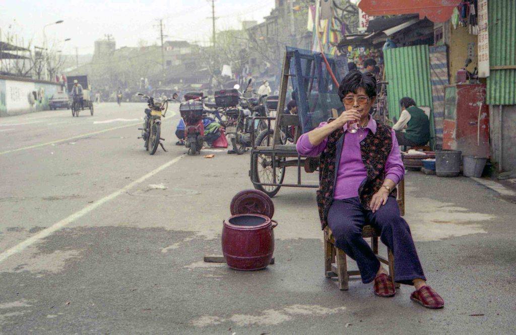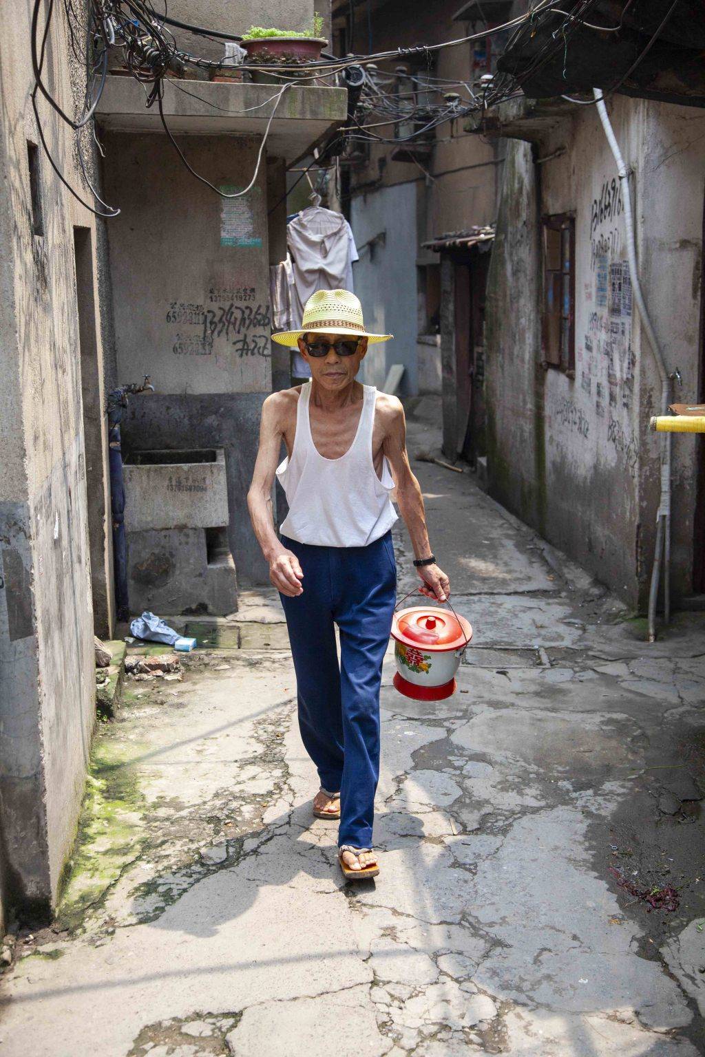 2009年,虹镇老街地区。一名肖姓老人在倒痰盂。该地区动迁后,他们一家搬去江桥一处安置房生活,再也不用倒马桶了。