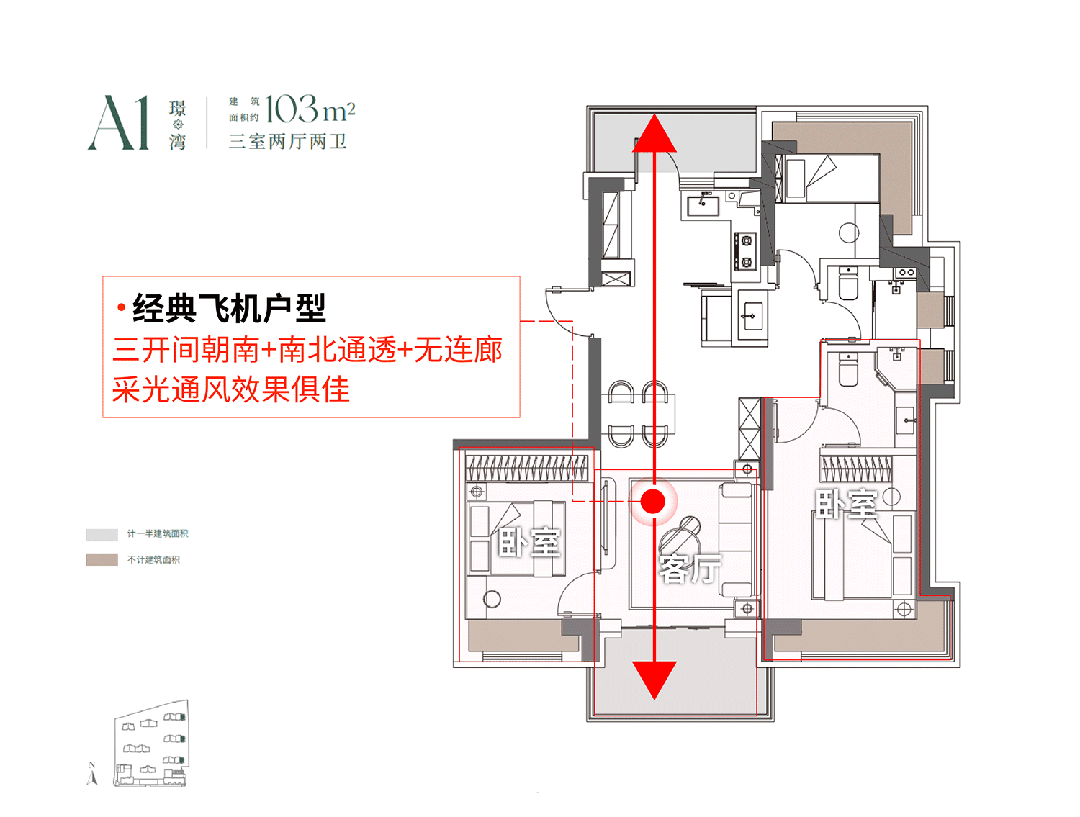 主卧+北次卧带270°转角飘窗,实得率+视野俱佳。