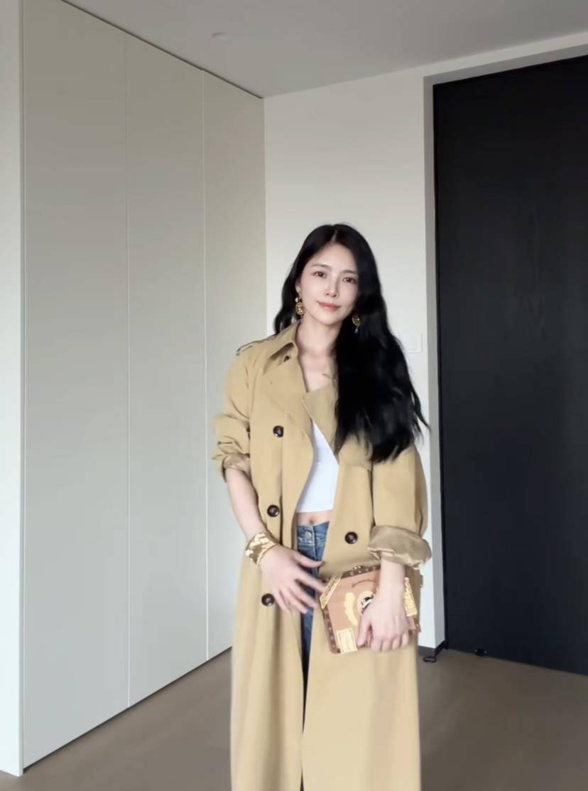 第三套,杜淳转向长衣区,拿出一件卡其色长风衣。风衣+牛仔裤是永不过时的经典组合,要想出彩,还得靠配饰。一支造型独特的雪茄包被选中,为飒爽的造型增添了一丝不羁与玩味。