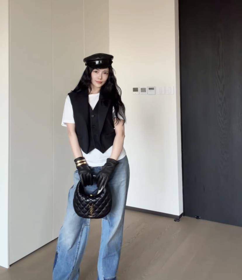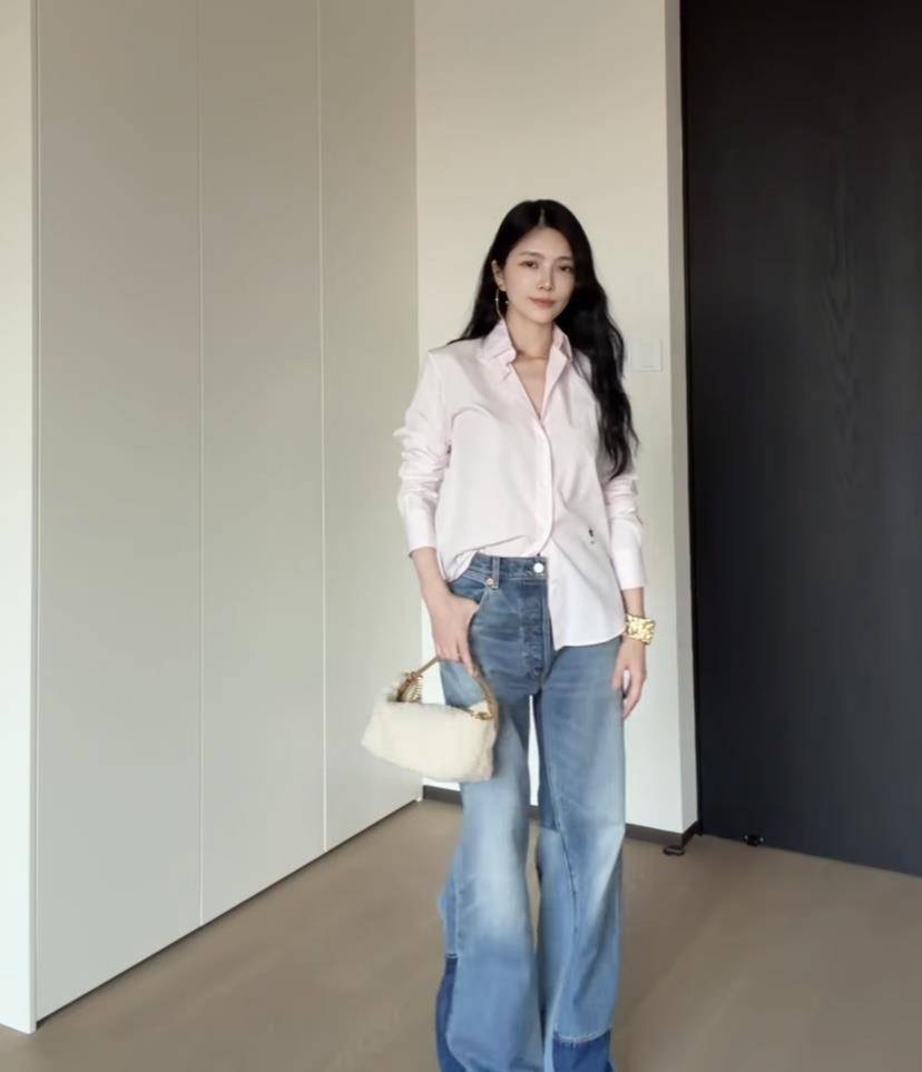 杜淳眼光毒辣,在上百条牛仔裤中精准狙击,挑出一条设计感十足的高腰阔腿款。不对称的撞色裤筒,瞬间打破了基础款的沉闷,原来牛仔裤也能这么玩出新花样!