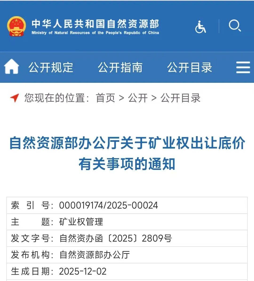 12月6日,自然资源部办公厅发布矿业权出让底价有关事项通知。通知指出,矿业权出让底价要遵循市场规律,接近公开、公平、充分竞争市场条件下的公允价值,由出让人确定,且不得低于出让起始价。确定矿业权出让底价时,出让人可委托矿业权评估机构评估,以评估结果作重要参考,也可采取询价、类比等方式确定。