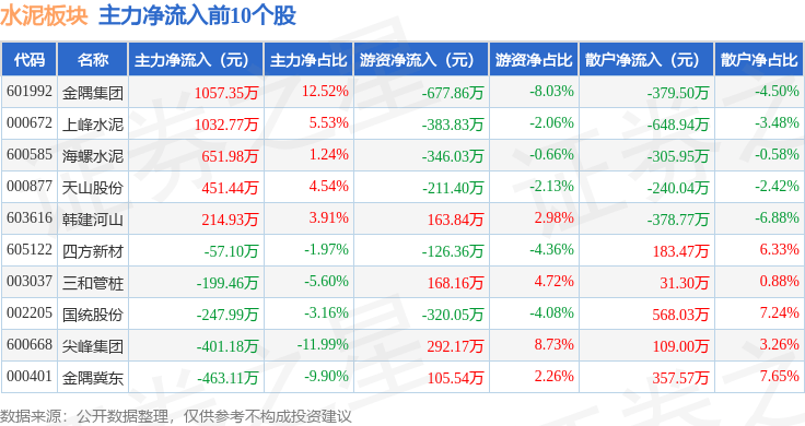 从资金流向上来看,当日水泥板块主力资金净流出2.12亿元,游资资金净流入1855.93万元,散户资金净流入1.94亿元。水泥板块个股资金流向见下表: